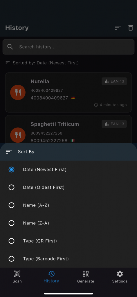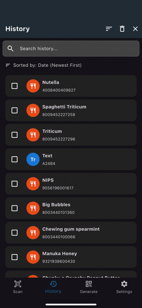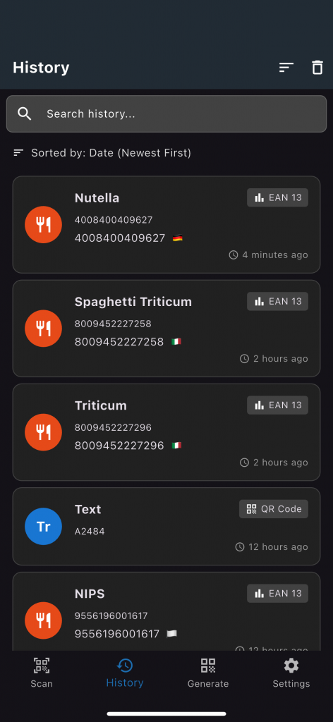 When you tap the History tab (the clock/recents icon on the bottom bar), you’ll see a list of entries with the most recent scans/generations at the top. Each entry might show an icon or small preview indicating what type of content it was (e.g., a little globe for a URL, a contact icon for a vCard, a fork-and-knife for a food product, etc.), along with a label or excerpt (like the name of a food product or the beginning of a text) and the date/time.