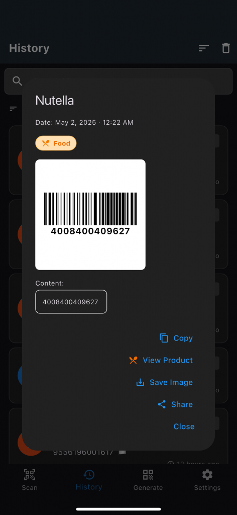 - View details of a past scan/code: Simply tap on any item in your history list. A detailed view will pop up, showing all the info about that entry. For example, if it was a QR code you generated, you’ll see the QR image and the content. If it was a scanned barcode of a product, you’ll see the number and maybe the product name. In this detail view, you’ll also get action buttons. Common options include Copy (to copy the content text to clipboard), Share (to share the content or image), and Save Image (to save the code image again). If the entry is a food product from Open Food Facts or a similar special type, you might see a “View Product” button – tapping that will bring up the full product info page again, just like when you first scanned it.