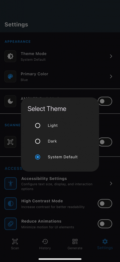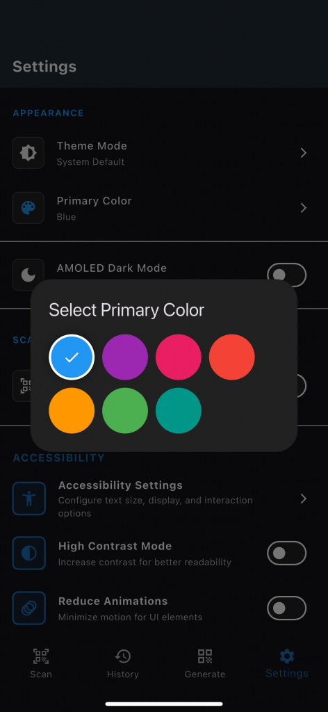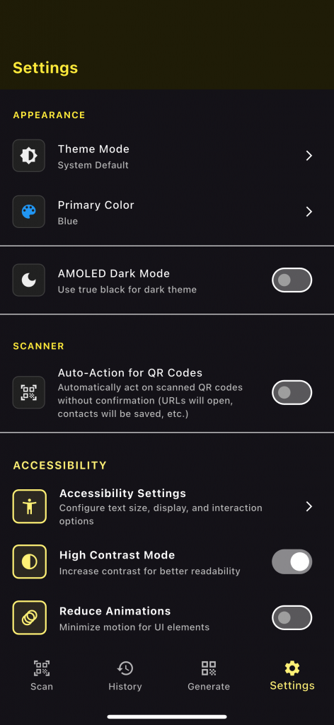 - Reduce Animations: If you are sensitive to motion or just prefer a snappier interface without visual effects, enable Reduce Animations. This will minimize or simplify the animations in the app (such as transitions between screens or scanning animations). The app will feel more instantaneous. This setting is also helpful for older devices to make the UI feel faster, and for accessibility to avoid any dizziness or discomfort some might have with too much motion.