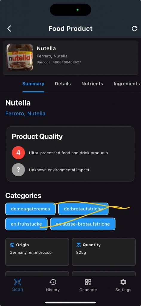 If the product isn’t found in the database, don’t worry – the app will simply show the barcode number and you might get a message that it’s not available on Open Food Facts. You can always try again or scan another item. The database is large and constantly growing, so most common products will show up.