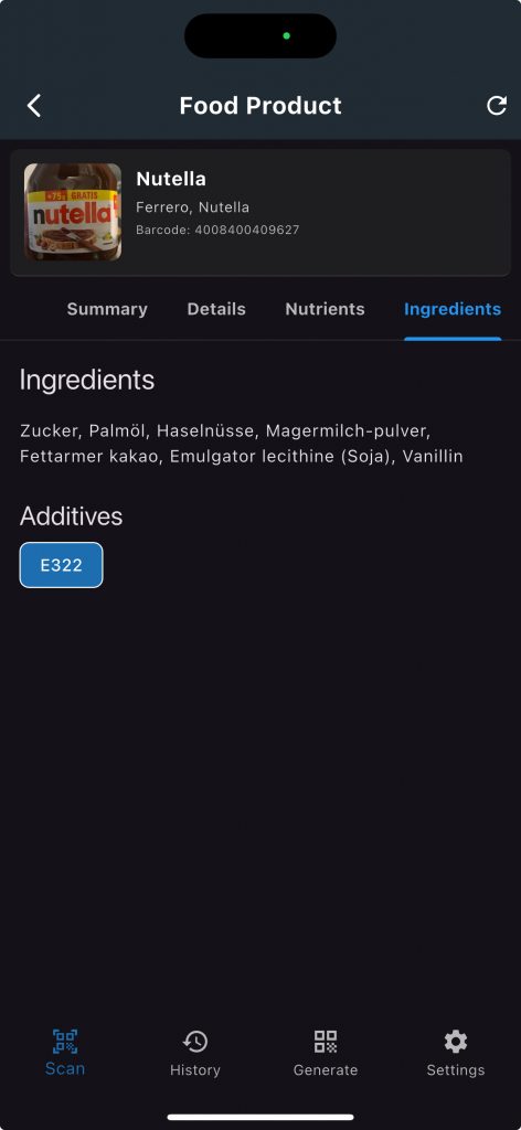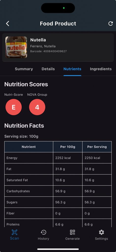 Note: To see the food product details, you’ll need an internet connection at least at the moment of scanning (since the app fetches the latest info from the online database). If you happen to be offline, the app will still decode the barcode number (so you’ll have the number in your History), and you can view the product info later when you’re online by tapping “View Product” in the History entry. There’s even a refresh button on the product info screen to update the data if needed.